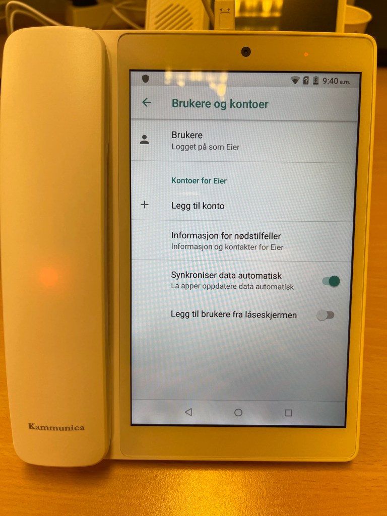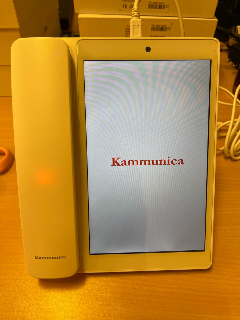 Kammunica fasttelefon/smarttelefon som vi også skal installere til lærerne på Raufoss barneskole. Vi lader smarttelefonen og logger inn med en google-kont. Så oppdaterer vi de nødvendige oppdateringene. Jeg går inn på Androids play butikk og laster ned appen Telenor MBN som skal mulig gjøre kommunikasjon. Etter det så kobler vi telefonrøret til selve enheten via Bluetooth. Det har vært nettverksproblemer siden det er mange enheter som skal laste ned samtidig.