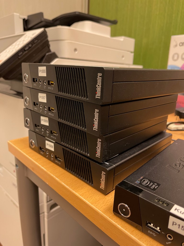I dag har jeg kastet en del elektronisk søppel. Jeg har vært med på et kursrom og hentet alle PC-ene. Jeg har installert Windows 10 Pro på alle disse maskinen, først så byttet jeg ut SSHD og erstattet den med SSD. Har også lagt til mer minne.